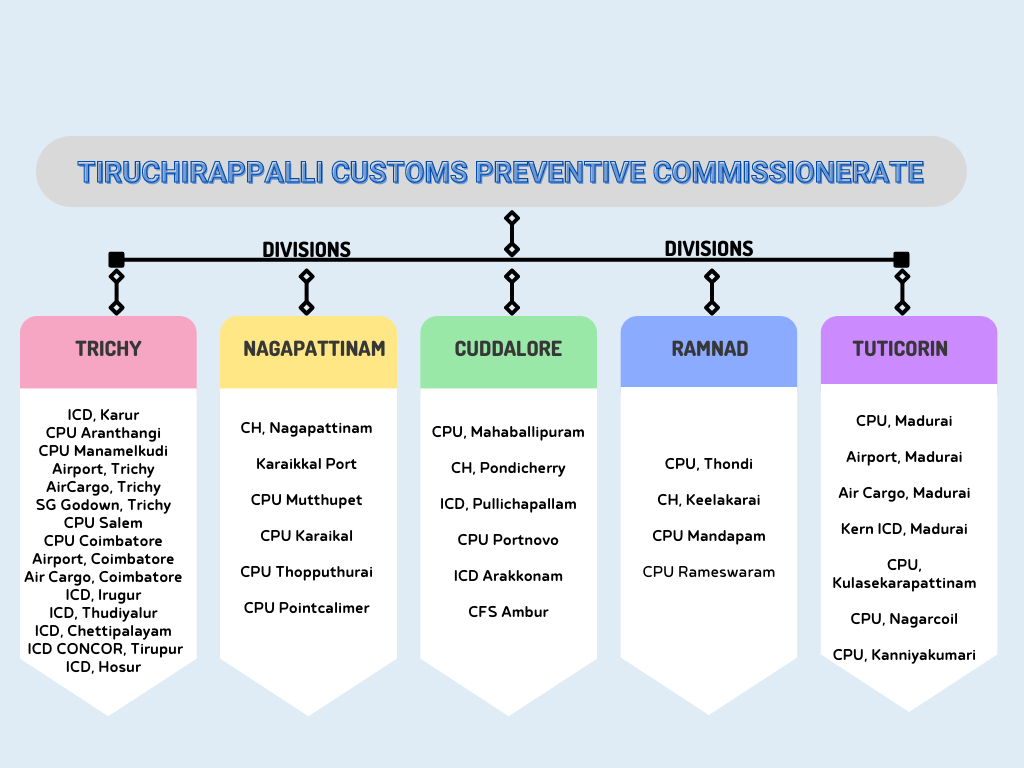 Presently, Tiruchirppalli Customs (Preventive) Zone is headed by Chief Commissioner of Customs and it has two Customs Commissionerates under its jurisdiction, each headed by a Commissioner viz. the Customs (Preventive) Commissionerate, Tiruchirappalli and the Commissionerate at the Custom House, Tuticorin.